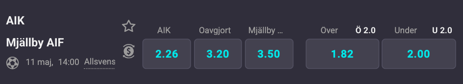 Det är AIK som är förhandsfavoriter med hemmaplansfördel i mötet. Hos Coolbet står en hemmaseger i 2,26 samtidigt som en bortaseger för Mjällby ger 3,50 gånger pengarna. Ett oavgjort resultat ger 3,20. Mjällby har gjort flest mål i Allsvenskan i år medan AIK har gjort en del färre. Över 2,0 mål står i alla fall i 1,82 gånger pengar där den undre linan ligger på 2,00.