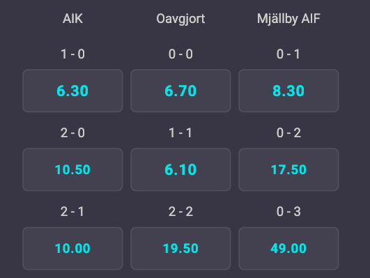 Om man kan lyckas att pricka in rätt slutresultat höjs oddsen. En 2-0-seger för AIK står i 10,50 medan samma resultat i Mjällbys favör ger 17,50 gånger pengarna. Det resultat som ger minst utdelning och anses som mest troligt är 1-1.