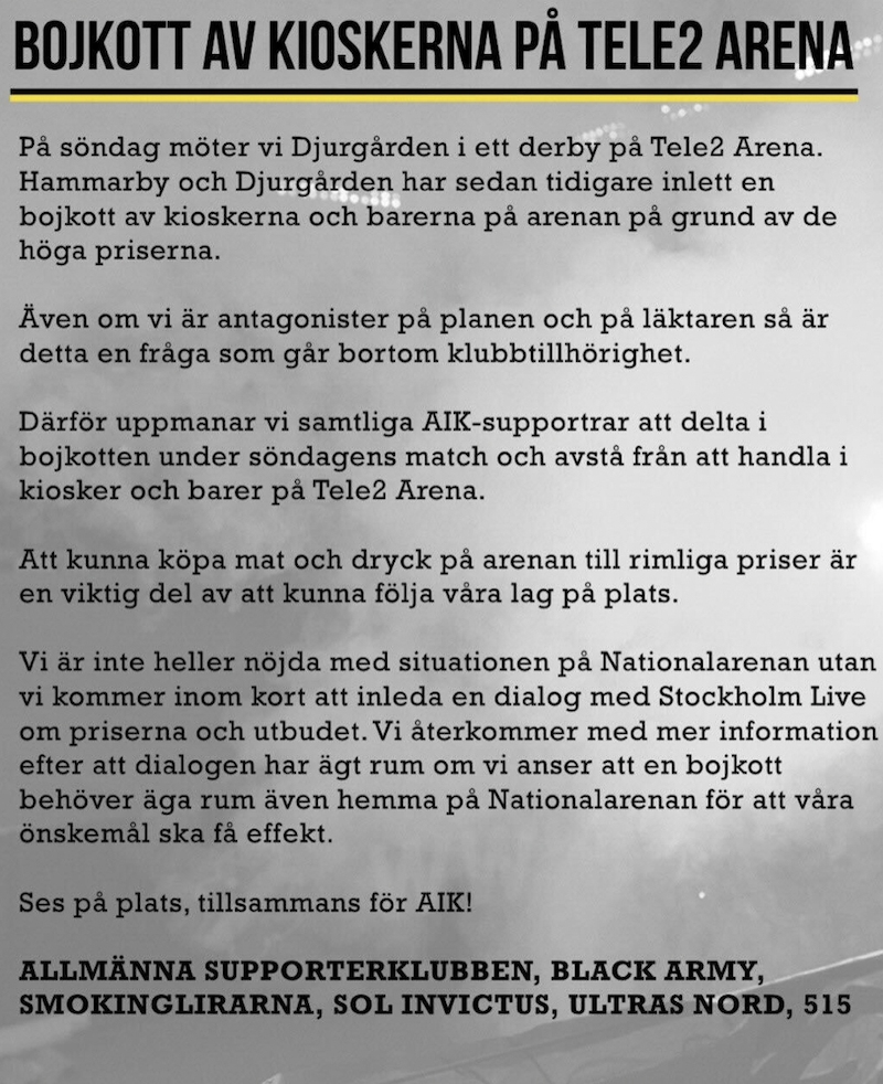 Djurgårdens och Hammarbys supporterföreningar uppmanar till bojkott av kiosker och serveringar på Tele2 arena.