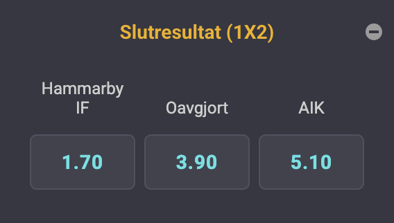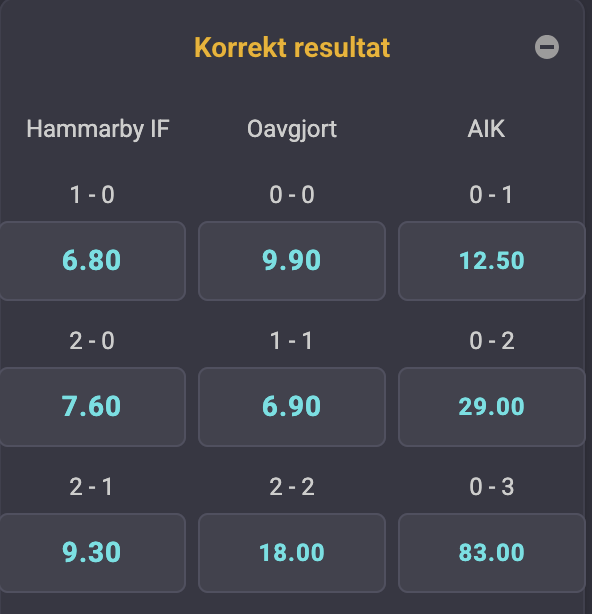 Och det mest sannolika resultaten anses 1-0 och 2-0 vara. För den som tror att AIK tar en klassisk 1-0 seger finns det däremot goda möjligheter att göra sig en hacka.
