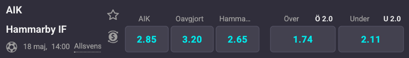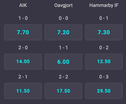 Om man lyckas pricka in rätt resultat i matchen finns det mer pengar att hämta. Det mest troliga resultat är 1-1 som står i 6,00 gånger pengarna. 2-0 till AIK ger 14,00 gånger pengarna där samma resultat i Hammarbys favör ger 12,50. De mer målsnåla resultaten ses också som mer troliga där 0-0 står i 7,20, 1-0 till AIK står i 7,70 och samma resultat till Hammarby ger 7,30 gånger pengarna.