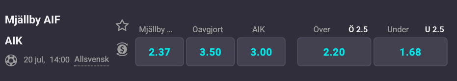 Hemmaplanen och tabelläget gör att Mjällby ses som knappa favoriter där en hemmaseger står i 2,37 gånger pengarna hos Coolbet. Ett oavgjort resultat ger 3,50 och en bortaseger för Gnaget står i 3,00. Det förväntas bli en målsnål match där under 2,5 mål står i 1,68 med den övre linan på 2,20.