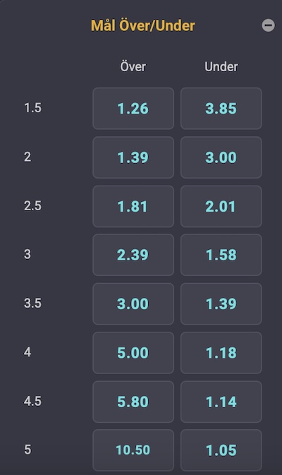 Om man tror på fler mål än så kan det finnas utdelning att hämta. Om man till exempel tror att det blir minst fyra mål i matchen får man tre gånger pengarna på insatsen.
