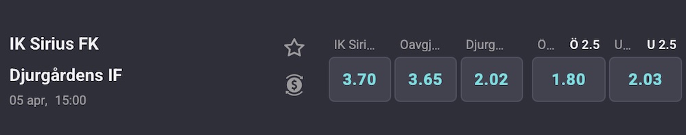 Djurgården gäller som favoriter i matchen. Den raka tvåan ger i skrivande stund 2,02 i odds hos Coolbet. Krysset betalar 3,65 och en Sirius-seger betalar 3,70 gånger pengarna. Oddssättarna hos Coolbet tror på en målrik tillställning vilket oddset på 1,80 över 2,5 mål visar på.