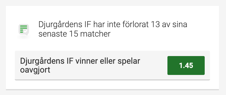 Till matchen har Unibet tagit fram specialodds utifrån Expertfakta – som baserar sig på aktuell statistik. Djurgården har inte förlorat i 13 av de 15 senaste matcher. Odds och länk till spelet hittar du i rubriken nedan: