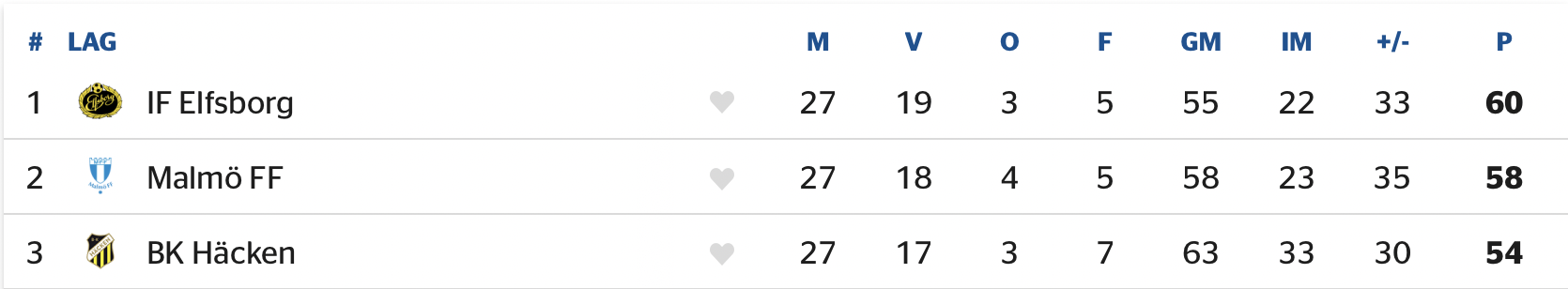 Tabellen ser ut som ovan. Elfsborg har två poäng att gå på medan Malmö FF har två måls bättre målskillnad (samt fler gjorda mål).