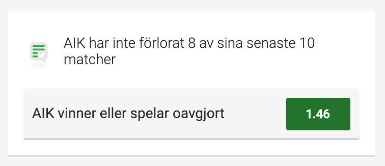 Till matchen har Unibet tagit fram specialodds som baserar sig på aktuell statistik. AIK har inte förlorat 8 av sina 10 matcher. Länk till oddset och fler spel hittar du i rubriken nedan: