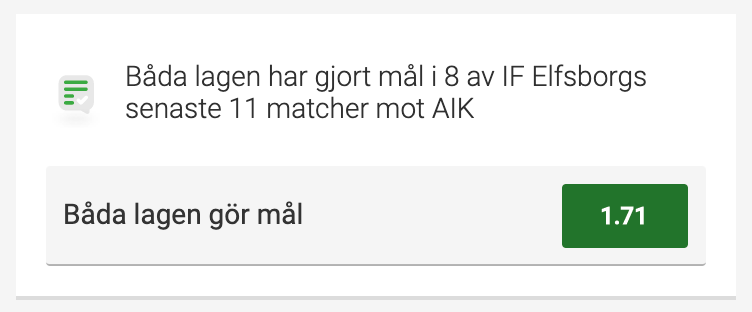 Till matchen har Unibet tagit fram specialodds som baserar sig på aktuell statistik. Både lagen har gjort mål i 8 av IF Elfsborgs senaste 11 matcher mot AIK. Länk till oddset och fler spel hittar du i rubriken nedan: