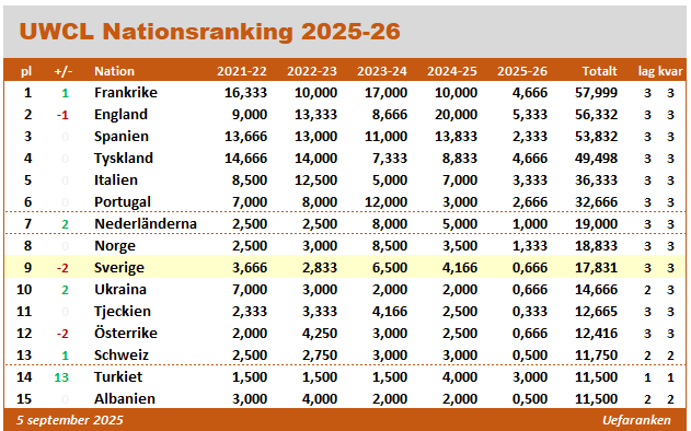 När Uefa publicerade den första nationsrankingen på damsidan efter säsongen 2003-04 låg Sverige i topp. Då samlades stjärnorna i Damallsvenskan och Umeå gick till final de tre första åren. I takt med att fler länder kommit ifatt och sprungit förbi allsvenskan har Sverige sjunkit på rankingen. Efter förra säsongen var man nere på sjunde plats, och efter årets två inledande kvalomgångar har Norge och Nederländerna petat ner Sverige ytterligare, till nionde plats. Placeringarna här är viktiga för var de svenska klubbarna får starta i kvalet 2027: