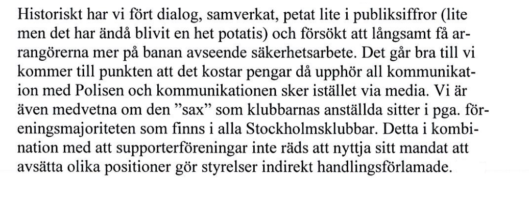 ”Saxen” som beskrivs i det första stycket handlar om att klubbanställda, enligt polisen från Stockholm, inte vågar ta beslut på grund av trycket som de utsätts för från medlemmarna. Personen anser också att polisen haft en för mjuk framtoning mot klubbarna under många år.