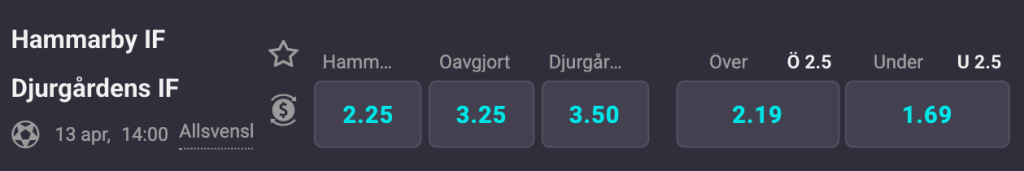 Enligt oddsen är det Hammarby som är favoriter. En vinst för de grönvita ger 2,25 gånger pengarna medan en Djurgårdsseger ligger på 3,50 i skrivande stund. Oddsen tror på en målsnål match i derbyt där under 2,5 mål ligger på 1,69 samtidigt som den övre linan ligger på 2,25.