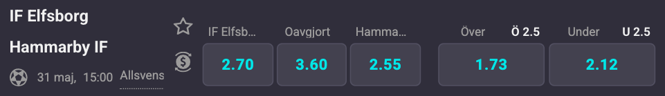 Det är jämna odds mellan lagen där allt kan hända men Hammarby står som knappa favoriter enligt oddsen. En bortaseger för Bajen står i 2,55 hos Coolbet, en hemmaseger ger 2,70 och krysset står i 3,60. Det väntas bli en målrik match då över 2,5 mål ger 1,73 gånger pengarna där den undre linan ligger på 2,12.