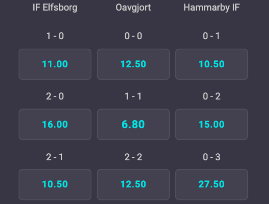 Mer pengar finns att hämta om man lyckas pricka rätt på resultatet i matchen. Det mest troliga resultatet är 1-1 som står i 6,80 gånger pengarna hos Coolbet. Exempelvis står 2-0 till Elfsborg i 16,00 samtidigt som samma resultat i Hammarbys favör ger 15,00 gånger pengarna.