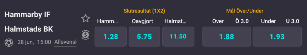 Med tanke på tabelläget är Hammarby förväntade favoriter inför drabbningen. En hemmaseger för Bajen ger 1,28 gånger pengarna hos Coolbet där en Halmstadseger står i hela 11,50 med krysset på 5,75. Målen förväntas rulla in i plural med då över 3,0 mål står i 1,88 där den undre linan ligger på 1,93.