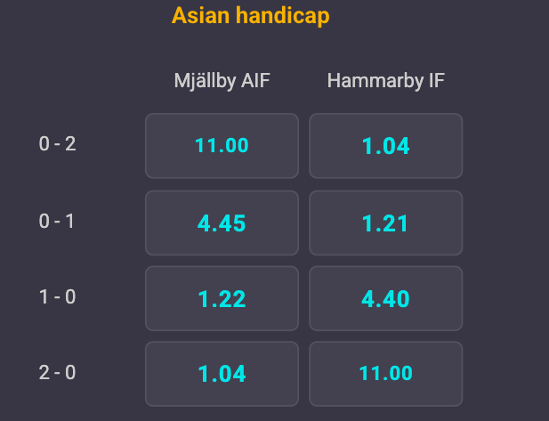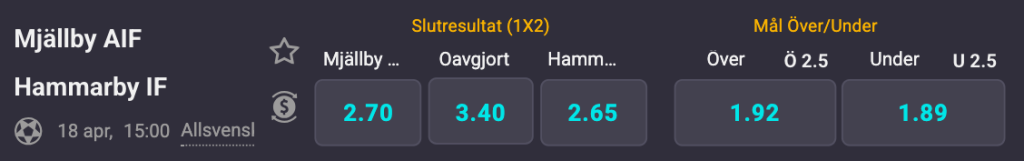 Det är väldigt jämna odds i matchen där Hammarby står som knappa favoriter. En hemmaseger för Mjällby står i 2,70 i skrivande stund samtidigt som en bortaseger ger snarlika 2,65 gånger pengarna. Ett oavgjort resultat ger mest pengar med 3,40 i odds. Det är lika öppet på målfronten med 1,92 i odds för att det blir över 2,5 mål där den undre linan ligger på 1,89.