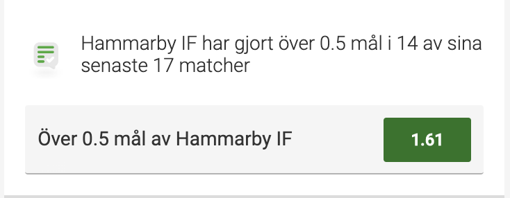 Till matchen har Unibet tagit fram specialodds utifrån Expertfakta – som baserar sig på aktuell statistik. Hammarby har gjort mål i 14 av sina senaste 17 matcher. Odds och länk till spelet hittar du i rubriken nedan: