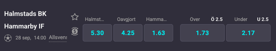 Med tanke på tabelläget är det naturligt att Hammarby är favoriter. En bortaseger för Stockholmarna står i 1,63 gånger pengarna hos Coolbet. En hemmaseger för Halmstad ger 5,30 med krysset på 4,25. Hammarby förväntas även fortsätta ösa på framåt då det väntas mål i matchen. Över 2,5 mål står i 1,73 med den undre linan på 2,17.