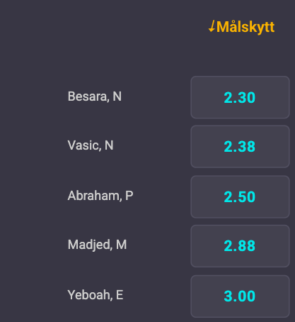 Även bland eventuella målskyttar är det Hammarby som dominerar. Mest troligt att näta under söndagen är skytteligaledaren Nahir Besara som har gjort mål i åtta matcher i rad inför matchen. Han följs något oväntat av Nikola Vasic som fortfarande inte är tillbaka från sin skada. Därefter finns Paulos Abraham och Montader Madjed innan första Halmstadspelare hittas i form av Emmanuel Yeboah.