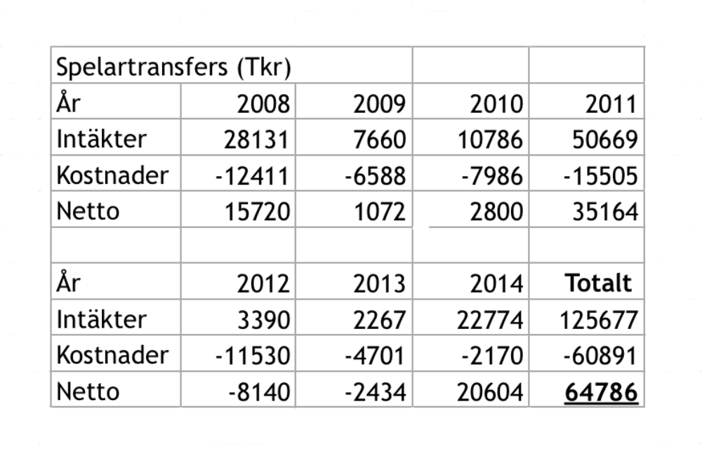 Apropå Jansson och Helsingborg fick jag ett mejl från Joel från supporterpodden Än går det vågor som jag gästade förra veckan. Joel jobbar med ekonomi och bör ha koll på sina saker (ni får mejla om ni upptäcker några felaktigheter!) Podd-Joel hade gått igenom Helsingborgs årsredovisningar för 2008-2014 och funnit att klubben gått 65 miljoner plus på övergångssummor under Janssons tid som sportchef. Här är det värt att poängtera att det endast handlar om rena transferkostnader och att sign on, lön, sociala avgifter och så vidare inte ingår, men siffrorna är anmärkningsvärda med tanke på hur ekonomin kraschade under samma period. Under sina år i Helsingborg sålde Jansson spelare för över 125 miljoner.