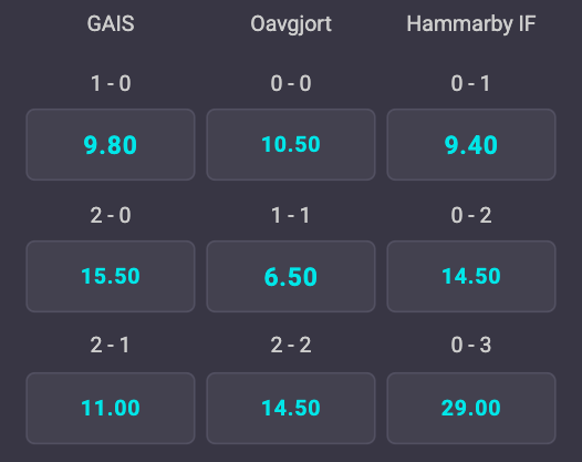 Om man lyckas pricka rätt resultat finns det högre odds att satsa på. Det mest troliga resultatet är 1-1 som ger 6,50 gånger pengarna. I övrigt ger exempelvis en 2-0-seger till Gais 15,50 gånger pengarna medan samma resultat i Hammarbys favör står i 14,50.