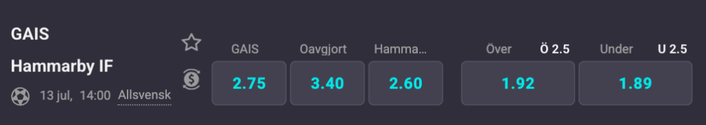 Hammarby är knappa favoriter men det är alltjämt väldigt ovisst inför drabbningen. En bortaseger för Bajen står i 2,60 hos Coolbet medan hemmasegern för Gais står i 2,75 med krysset på 3,40. Över 2,5 mål står i 1,92 där den undre linan ligger på 1,89.